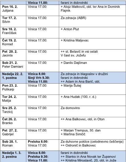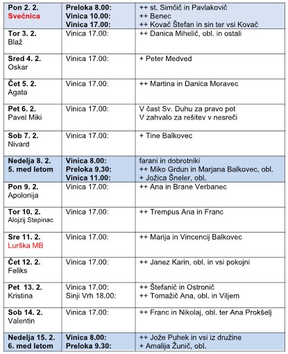Čiščenje in krašenje: 7. 2. Hrast 1. sk.; 14. 2. Hrast 2. sk.; 21. 2. Nova Lipa 1-20; 28. 2. Nova Lipa 20 dalje; 7. 3. Učakovci.